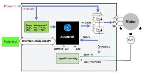 ADM16x是一款高度集成的高性能BLDC/PMSM控制器,內(nèi)部集成了6路 NMOSPre-Driver,運(yùn)算放大器,PGA,比較器,高速 ADC,SCI,SPI 等模塊。同時(shí),它采用高性能16位CPU,內(nèi)嵌 32Kx16 位 Flash, 512x16位ROM,最高工作頻率為40MHZ,可滿足高性能無(wú)刷電機(jī)控制的應(yīng)用要求,并簡(jiǎn)化系統(tǒng)成本。