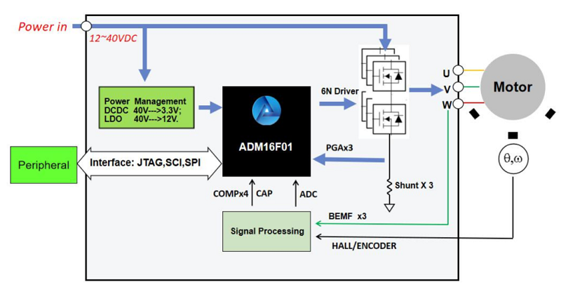 進(jìn)芯電子致力于為業(yè)內(nèi)提供高集成度、高性能及高性價比的數(shù)字信號處理器芯片(DSP),ADM16F01完全滿足三相BLDC/PMSM電機(jī)控制的應(yīng)用需求。除電機(jī)控制外,ADM16F01還適用于低壓電動工具、低壓水泵、低壓家電(風(fēng)扇或吸塵器)以及電動自行車行業(yè)等領(lǐng)域。