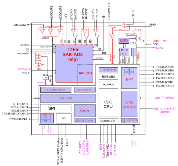 主頻 100MHz高性能16位CPU,采用哈佛總線架構(gòu),集成算力加速單元;