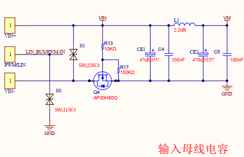 輸入通過N管,實現(xiàn)防反功能。使用CE1、L1和CE2,構成π型濾波。能有效減少電源的干擾。