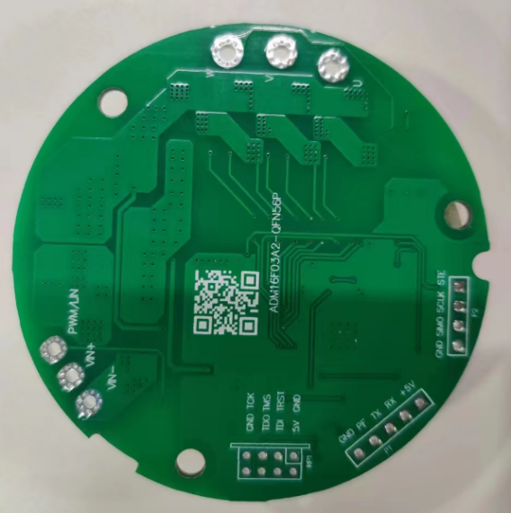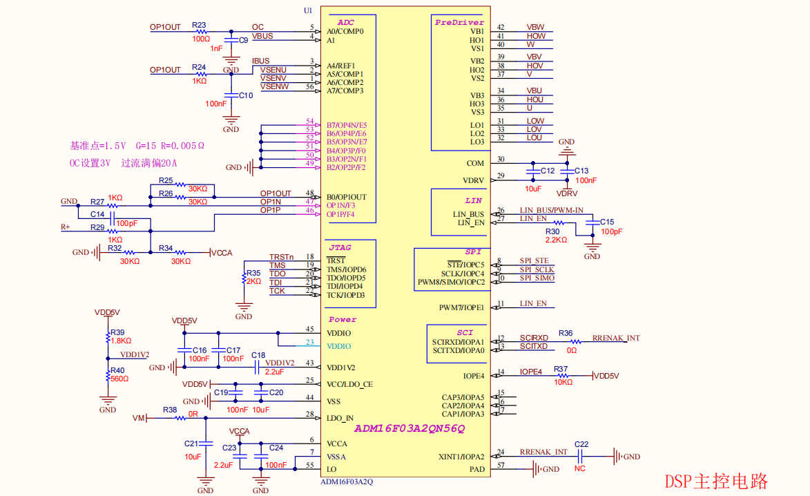電路模塊主要包括: 輸入防反母線電容輸入部分、ADM16F03A2最小系統(tǒng)、功率橋電路、ADC母線采樣電路、單電阻采樣運放采樣電路、自舉電路和PWM/LIN通訊反饋電路。