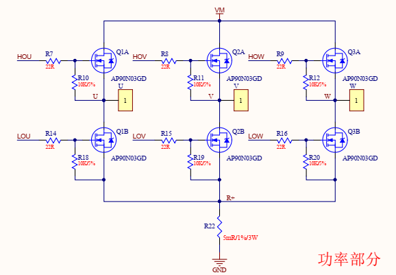 功率橋電路采用上下管均為NMOS的配置,總計6個NMOS組成三相H半橋驅動電路。