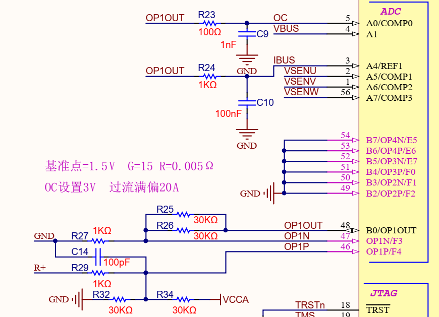 單采樣電阻0.005R,通過差分走線至ADM16F03A2的OP1的獨立運放電路進行運放輸入到芯片口采樣進行運算。